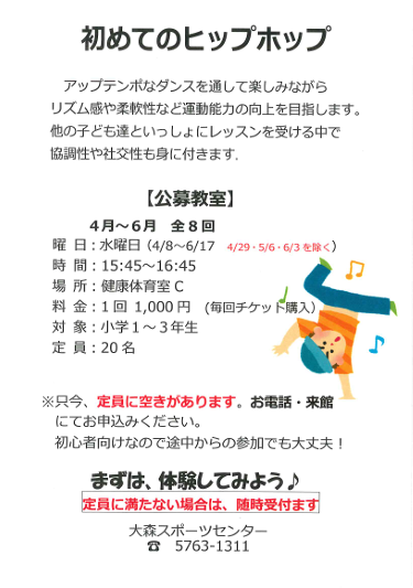 「初めてのヒップホップ」追加募集のお知らせ(4月~6月)